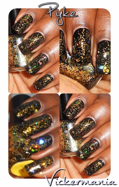 Pyke is described as a black jelly filled with multi sized gold and gold holo glitters. This is one coat over Wet N' Wild black creme. No problems with glitter coverage here, it's jam packed so you get even glitter distribution. The formula on this one was a bit thick and chunky because of so much glitter that I had to layer it over a base color because when trying to build it up to opacity on it's own it was just too chunky.